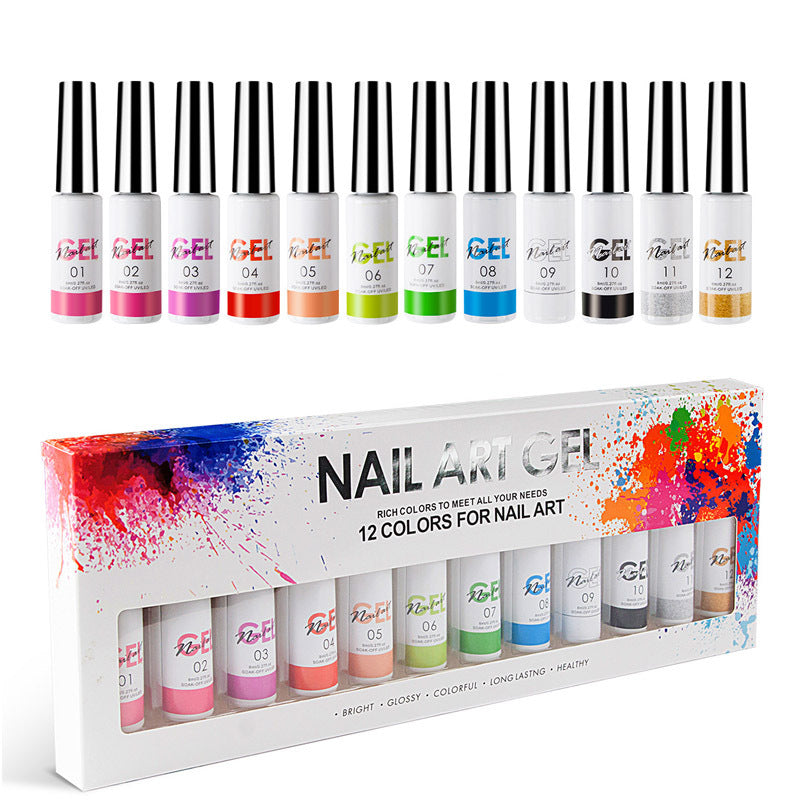 This painted gel covers a wide range of 12 colors for all different needs! It includes rainbow colors, black, white, glitter silver and gold. Come and create your Halloween nails!